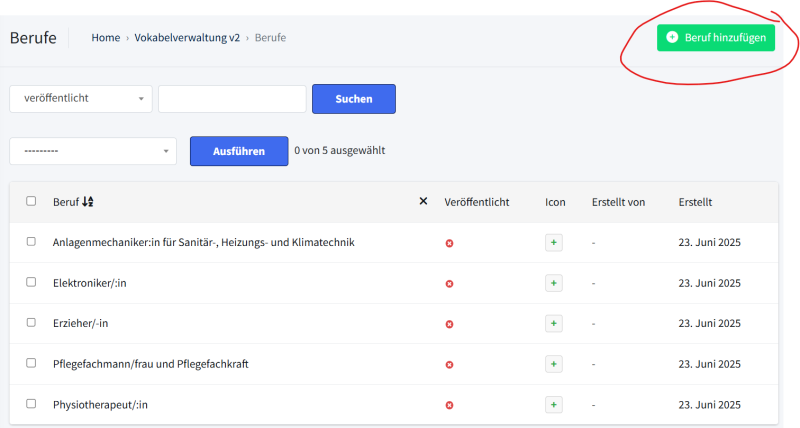 Zuerst wird der Beruf erstellt: