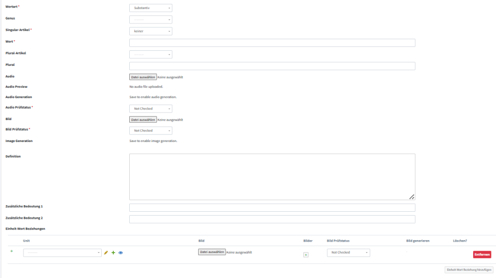 Die Felder „Wortart“, „Genus“, „Singular Artikel“, „Wort“, „Plural Artikel“ und „Plural“ werden ausgefüllt: