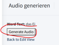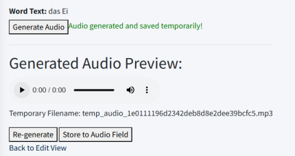 Wenn das Audio gut ist, kann es mit dem Button „Store to Audio Field“ in der Übersicht des Wortes gespeichert werden. Ist das Audio schlecht, sollte auf dem Button „Re-generate“ ein neues Audio erstellt werden.